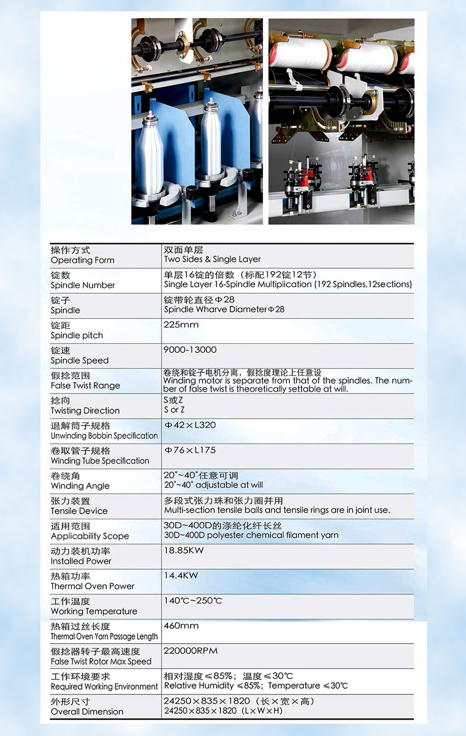 本設備適用于滌綸長絲進行倍捻、定型(預縮)、假捻的一步法加工,生產的縐絲用作滌綸仿真絲織物的原料。